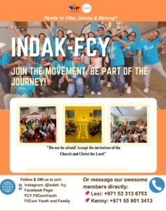 Ang Indak FCY ay malugod na nag-aanyaya sa mga kabataang Pilipino na may edad, 18 – 35 na maging bahagi ng kanilang Youth Group sa pamamagitan ng mga programa sa pagbuo at aktibong pakikilahok sa mga serbisyo sa simbahan at komunidad – isang makabuluhang pananampalataya, paglilingkod at pagsasama-sama para sa paghahanda sa World Youth Day 2027 in Seoul, South Korea.
