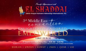 Ang El Shaddai DWXI Prayer Partners Fellowship International Inc. ay malugod na nag-aanyaya sa lahat na dumalo at makiisa sa nalalapit na 3rd Middle East Convention na may temang Enlightened, Endured, Empowered. Ito po ay gaganapin sa ika-27 ng Setyembre, 2025, 8:30am – 5:30pm, St. Anthony of Padua, Catholic Church, Ras Al Khaimah, UAE