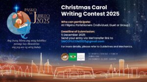 • The song should reflect Catholic values and embody the theme: PASKO SA JUBILEO 2025: Ang Inang Maria ang ating Kalakbay, Patungo Kay Hesukristo, ang Pag-asa ng ating Buhay (Mary, Our Guide, Leading Us to Christ, The Hope of Our Lives)
